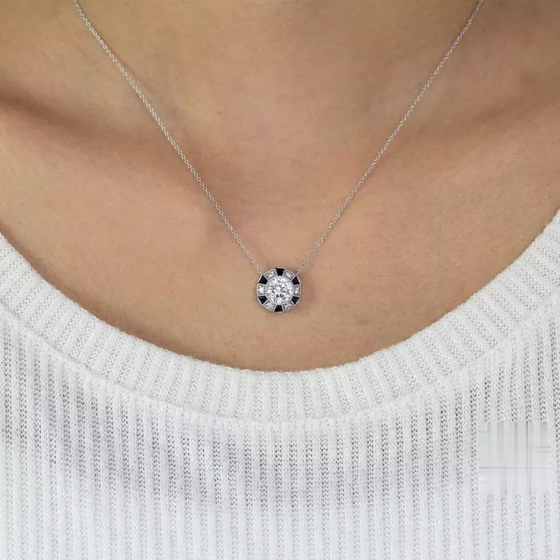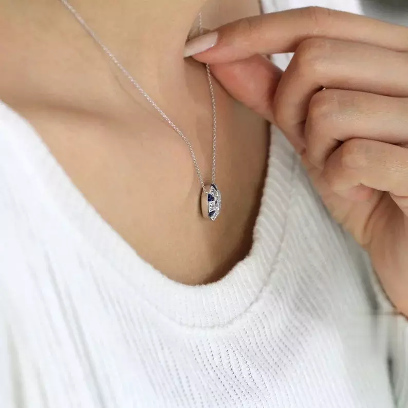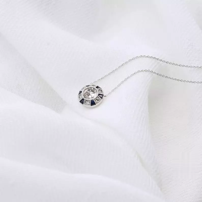 2.0 cttw Art Deco Blue Sapphire Halo Necklace Bridal Necklace Vintage Elegant Necklace Milgrain Necklace