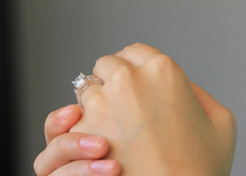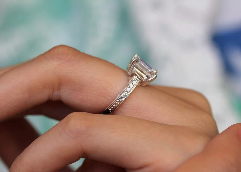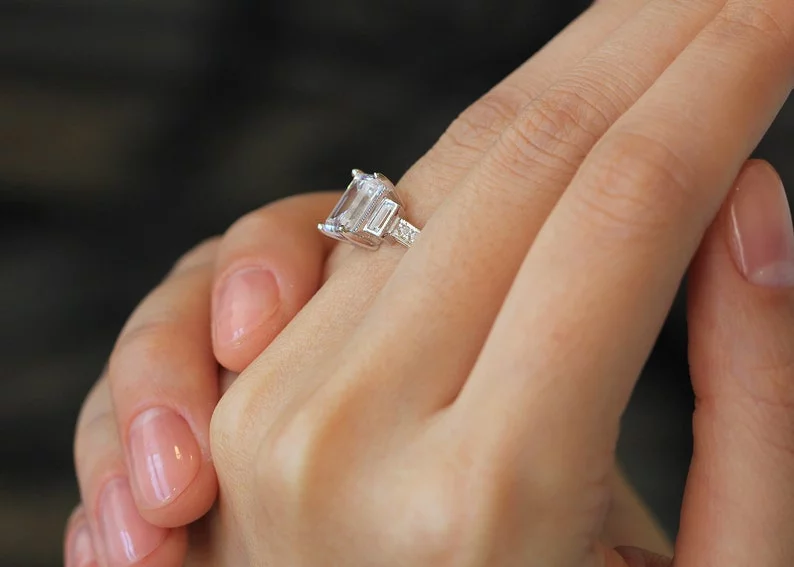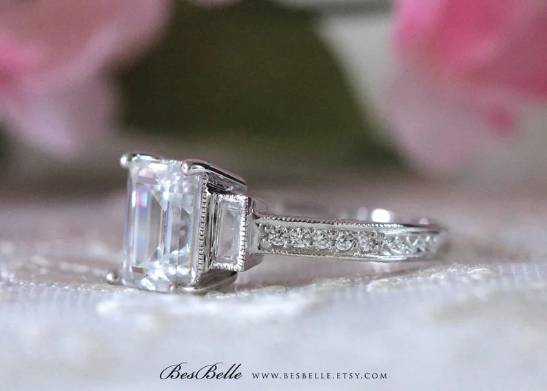 -Diamond cutting: Emerald cut (center), baguette cut (side) & brilliant pave set cut