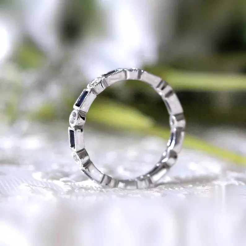 -Diamond cutting: Brilliant cut and baguette cut sapphire blue stones