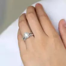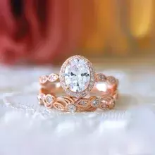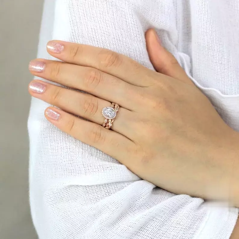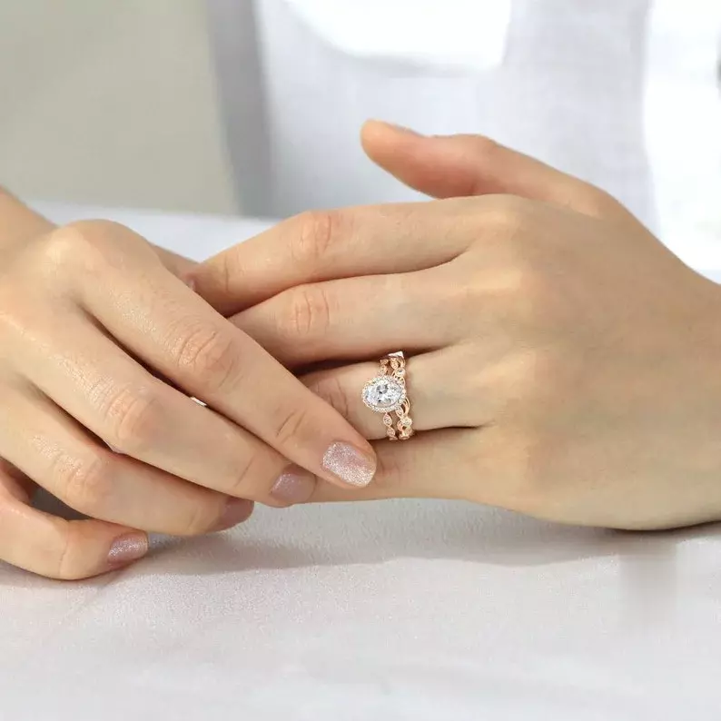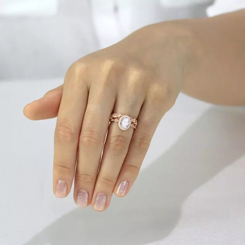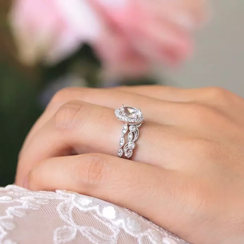 2.20 cttw Art Deco Bridal Set Ring Oval Halo Engagement Ring w/ Leaf & Vine Vintage Wedding Ring Dainty Bridal Set