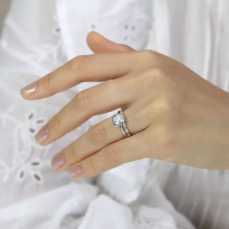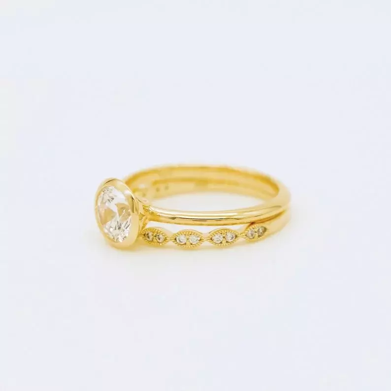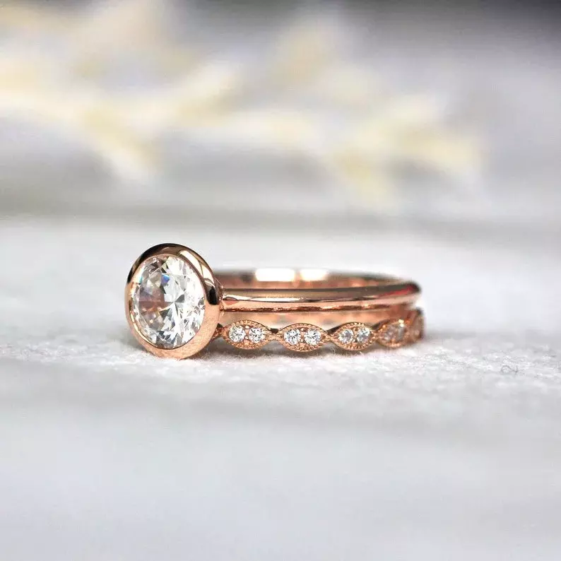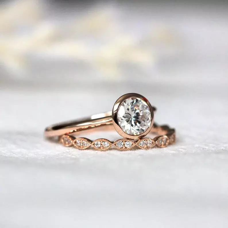 1.42 cttw Round Bezel Solitaire Ring Set Brilliant Cut Diamond Simulant Engagement Ring w/ All or Half Art Deco Eternity Ring
