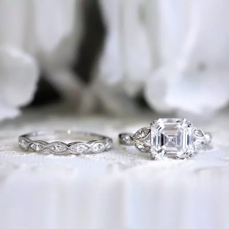 - Diamond cutting: Asscher cut (center), Marquise cut (side)