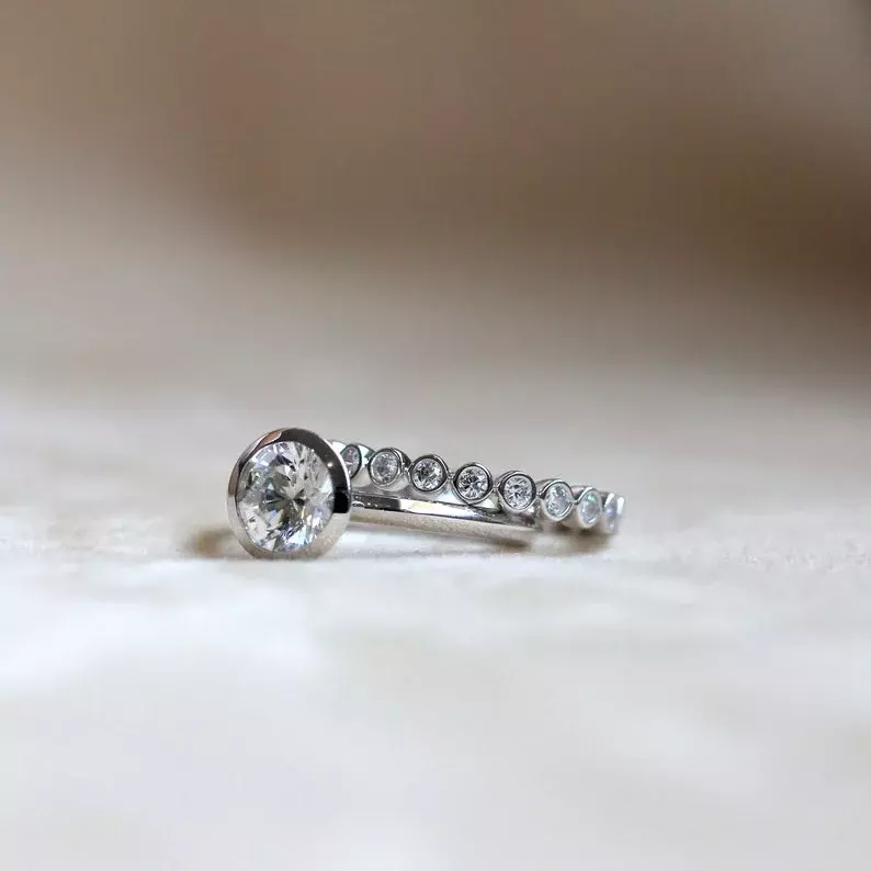 1.65 cttw Round Bezel Solitaire Ring Set Brilliant Cut Diamond Simulant Engagement Ring w/ Full or Half Bezel Eternity Ring