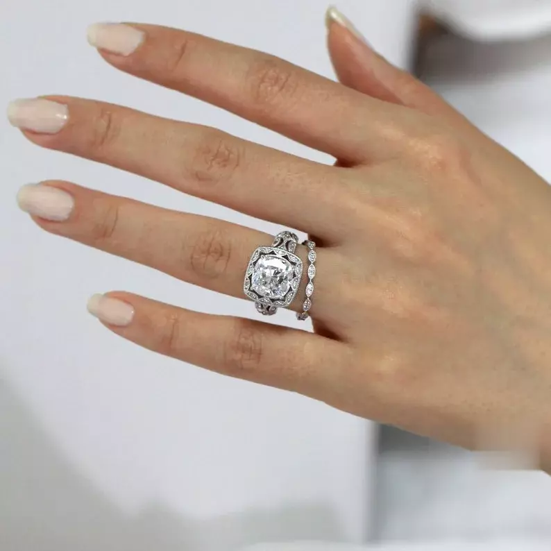 4.75 cttw Vintage Milgrain Edwardian Bridal Set Ring Cushion Cut Engagement Ring w/ Full or Half Art Deco Band Ring
