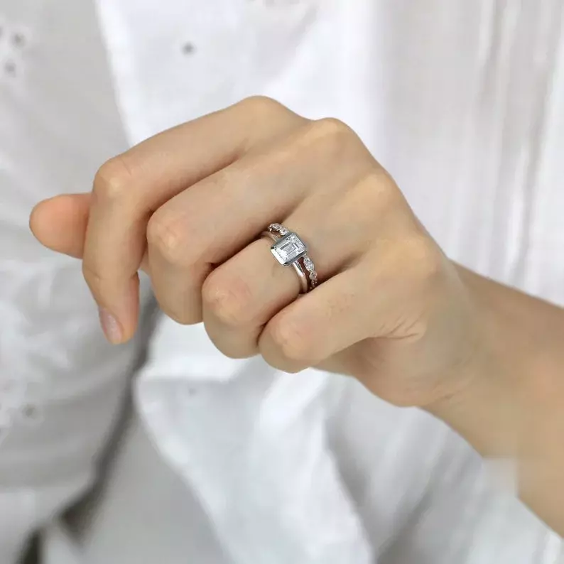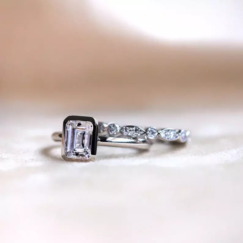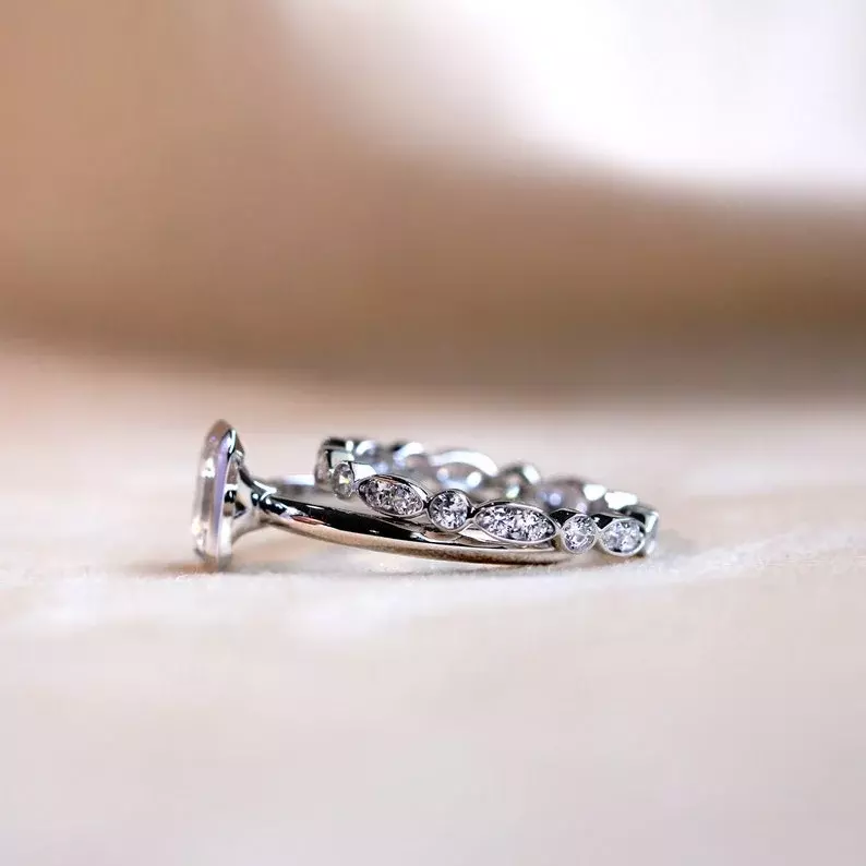 1.56 cttw Art Deco Emerald Bezel Solitaire Ring Set Oval Cut Engagement Ring w/ Full Maquise & Dot Art Deco Eternity Stack Ring